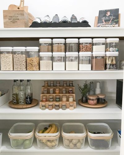 One of the biggest 2021 kitchen trends just happens to be pantry organization—and there are so many ways to go about prettying yours up no pantry ideas. Adding clear labels to different sized containers and jars will make your life a whole lot easier.